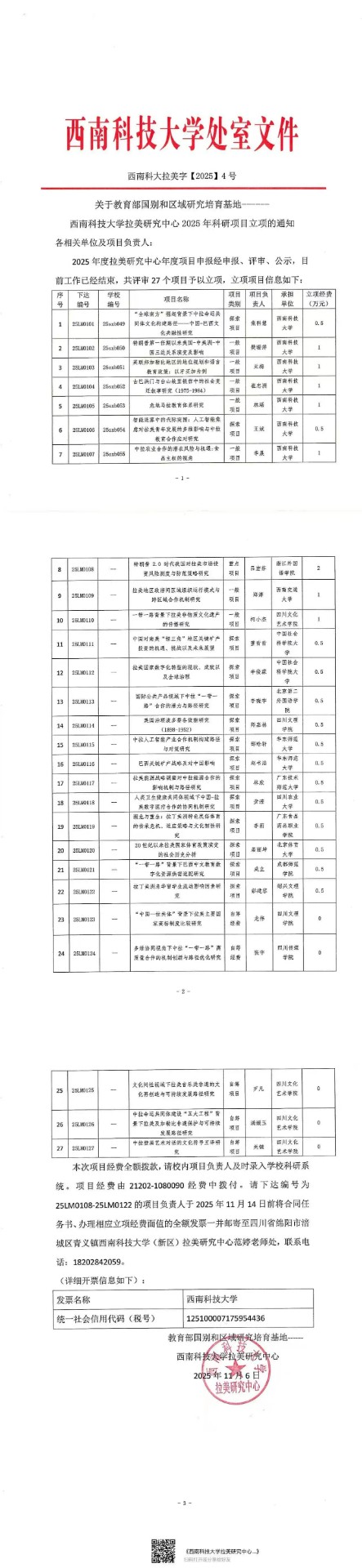11月6日,教育部国别和区域研究培育基地——西南科技大学拉美研究中心发布2025年度科研项目立项通知,经公开申报、专家评审与结果公示,共27项课题获准立项,其中四川文化艺术学院文物与博物馆学院、中国非物质文化遗产研究院柯小杰、歹凡、满媛玉、关键四位教师主持的项目榜上有名,立项数量与质量均创历年新高。
