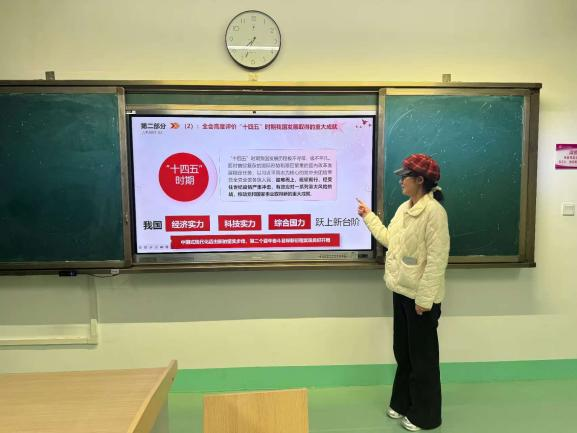 围绕PPT展示的“十四五”时期重大成就,同学们共同回顾了过去五年我国经济实力、科技实力、综合国力跃上新台阶的历程,深刻认识到以习近平同志为核心的党中央团结带领人民取得的“极不寻常、极不平凡”的成绩。在学习“十五五”时期发展原则与目标时,大家重点把握“坚持党的全面领导”“坚持高质量发展”等核心要求,明确了“高质量发展取得显著成效”科技自立自强水平大幅提高”等七大主要目标,以及2035年基本实现社会主义现代化的远景展望。