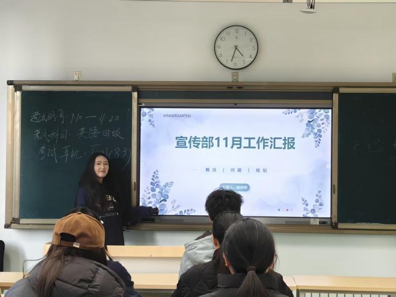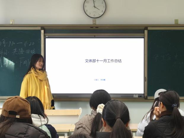而后,宣传部副部长解婷婷进行汇报。宣传部在十一月撰稿组7人撰写20篇稿子并存档;摄影组10人拍摄百余张照片用于新闻图片;新媒体组10人完成28篇公众号新闻发布并同步至官网;海报组6人完成策划2幅海报。但同时在工作中也存在新闻发布时效性不强、稿件格式不够规范、沟通效率有待提高等问题。针对以上情况,副部长已提出强化时效管理、统一稿件格式、优化协作流程等改进措施,并对下一阶段工作做出了相应规划。
