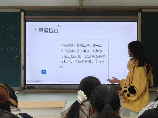 首先,文体部副部长吴敏进行汇报。文体部持续落实周一至周五早操及晚自习的考勤管理工作,按时完成数据统计与通报。同时,部门成功举办“音为有你 乐动时光”主题活动,有效丰富了学生课余生活,提升了学院集体凝聚力。同时,工作中也发现同学们早操参与积极性不高、晚自习纪律管理有待加强等情况。针对以上问题,部门已初步拟订改进方案,重点包括优化早操组织形式、完善晚自习检查机制等具体措施。