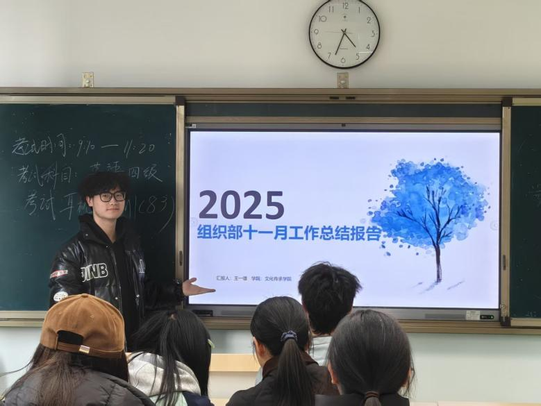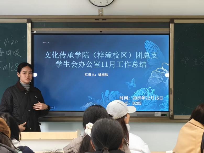 2025年12月15日16时,文化传承学院团总支学生会在B栋205召开了十一月工作总结会议。会议由文体部副部长吴敏主持,文化传承学院团总支书记白妙出席会议并听取汇报,学生会主席团成员,各部门干部与优秀干事参会。