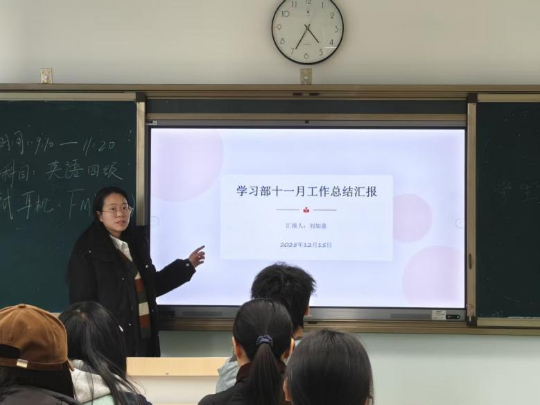 最后,学习部副部长刘如意进行汇报。学习部本月在持续推进日常查课与校园文明督察的同时,也成功举办了“秋韵三趣文游会”特色活动,充分展现了学院学子良好的精神风貌与文化素养。部门亦对本阶段工作进行了系统复盘,总结经验、反思不足,为后续优化提供依据。在此基础上,副部长对下阶段工作重点做出了初步规划。