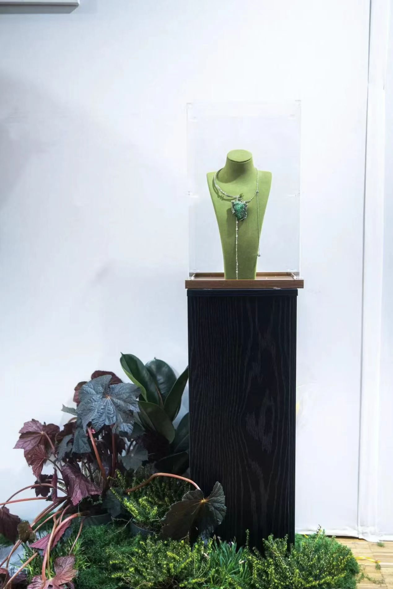 群英荟萃,佳作纷呈。众多优秀艺术家齐聚一堂,带来了风格迥异、独具匠心的艺术作品。我院石晓宇老师的国家艺术基金项目结项作品也荣幸登上了此次展览的舞台。该作品的设计灵感汲取自彝族文化中“山川有灵”的自然哲学。其设计核心凝练于彝绣与漆器中经典的火焰纹与山川纹,以流畅且富有生命力的线条,巧妙勾勒出翡翠与祖母绿主石的轮廓。其选用的温润翡翠,象征着苍翠连绵的彝乡山水;同时配以璀璨的祖母绿,宛如山林间闪烁的灵光,二者相互碰撞,构成了一幅深邃而神秘的生态画卷。作品通过金属的现代结构,将古老纹样进行解构与重组。翡翠的浑厚不仅赞颂了民族智慧与自然力量的交融,更以高级珠宝的语言,让古老传说在当代焕发出全新的生命力。此次展出的作品历经石晓宇老师的精心创作,凝聚了她对艺术的深刻理解与执着追求,在展览中与众多佳作交相辉映,共同构建起了一场精彩纷呈的艺术盛景。