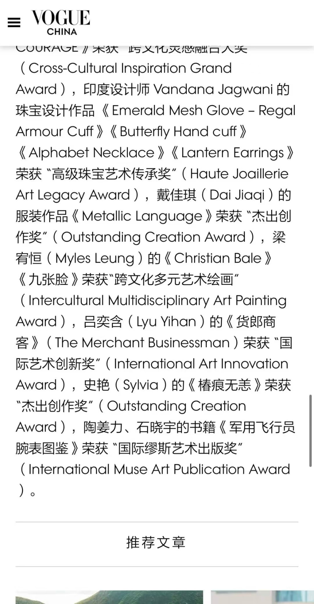 本次展览的成功举办,引起了广泛关注与热烈反响。人民日报,作为国内最具权威性和影响力的媒体之一,对展览进行了深入细致的报道。报道既充分肯定了本次特展的积极意义,也彰显了对策展人石晓宇老师辛勤付出的认可。vogue等众多海外媒体也对此次展览进行了报道。
