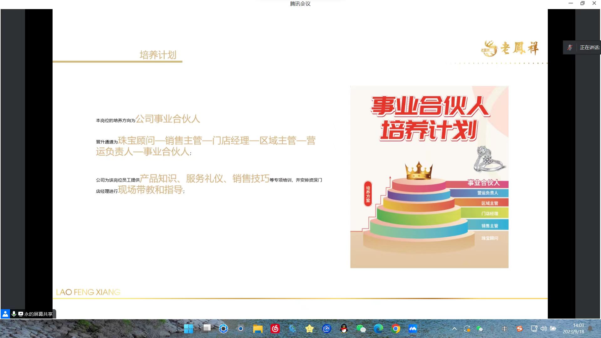 接下来在冯经理的讲话中得知,老凤祥的门店发展很快,急需人才干部。许经理首先简述了管培生计划,详细介绍了老凤祥企业的发展,具体介绍各种门店的形象,不同门店的多种适用场景。接下来讲述了相关产品,首先介绍了古法金,主打传承中华文化,其次介绍了以老凤祥葫芦为例的时尚首饰,最后讲解了公司的员工培训机制,团建活动类型以及事业合伙人。