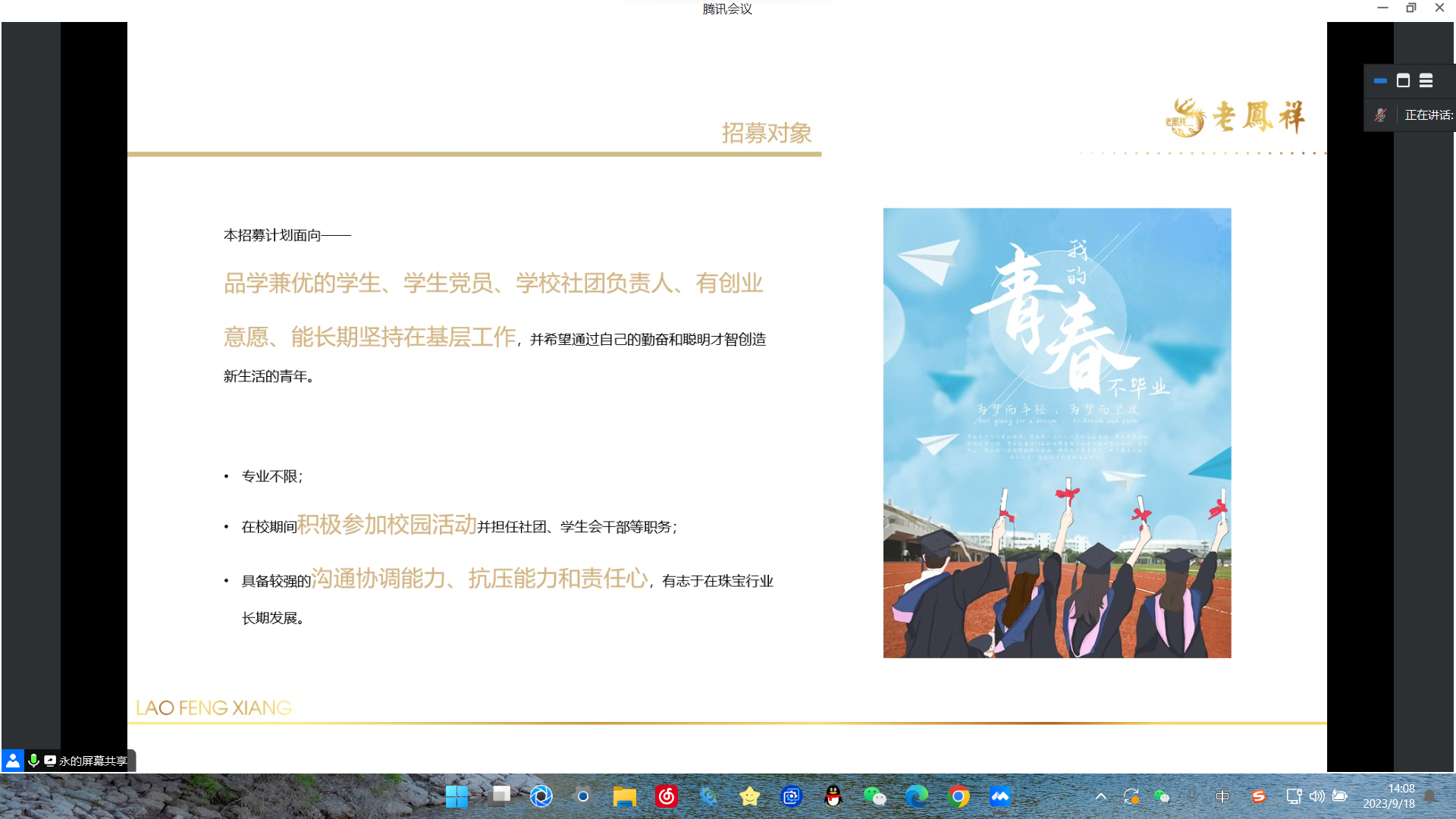 最后李政作老师作出总结,同学们可准备好个人简历、作品集和自荐信等材料,后续在与老凤祥专业招聘团队的交流中,同学们可以充分展示自己的才华和热情,同时了解更多关于老凤祥公司的发展机遇和职业发展规划。