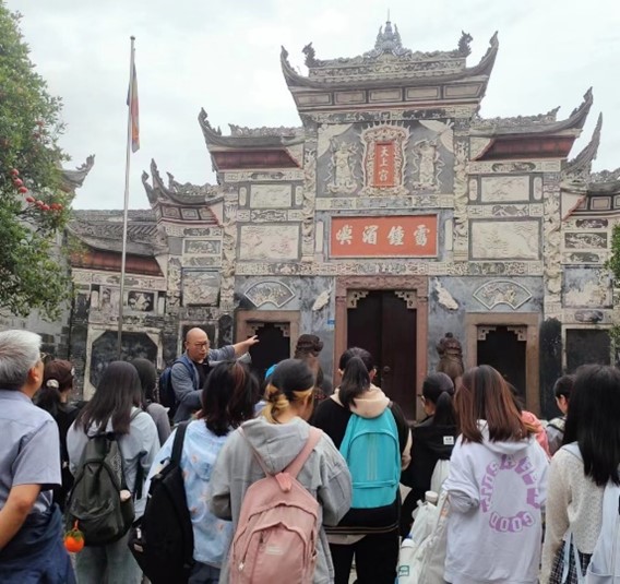 接着参观了南华宫,李庄南华宫位于下河街中段(现为滨江路),坐南向北,与大桂轮山隔江相望,占地面积2250平方米,始建于清代乾隆年间,又于光绪二十二年(1896)重建。后于宣统二年(1910)培修,现保存基本完整。魏老师为历建专业学生讲述了南华宫“南华”两字的由来,并解析了“曹溪香远”四字的含义。