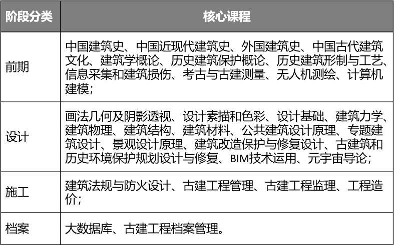 画法几何及阴影透视、设计素描和色彩、设计基础、建筑力学、建筑物理、建筑结构、建筑材料、公共建筑设计原理、专题建筑设计、景观设计原理、建筑改造保护与修复设计、古建筑和历史环境保护规划设计与修复、BIM技术运用、元宇宙导论