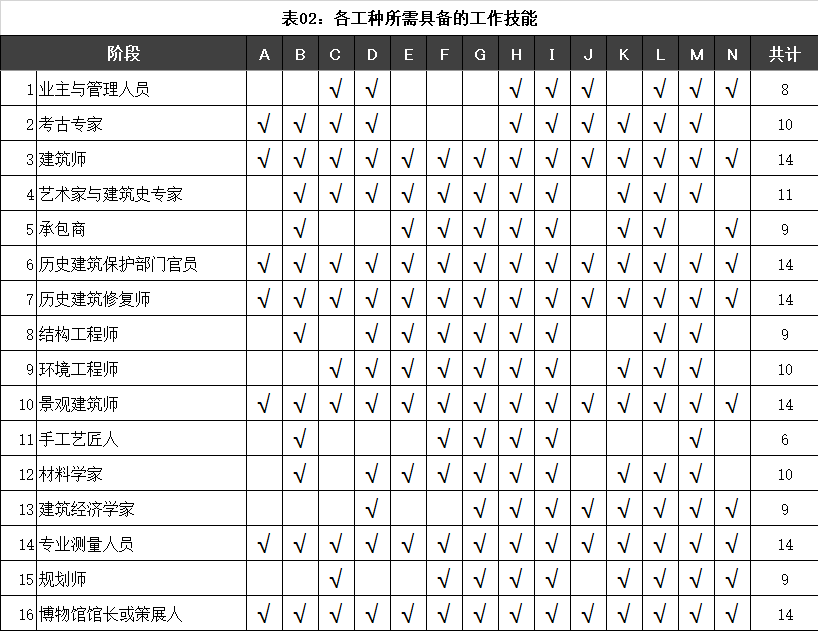 表格中A-N代表各工种所需具备的工作技能,共计14条,含义如下: