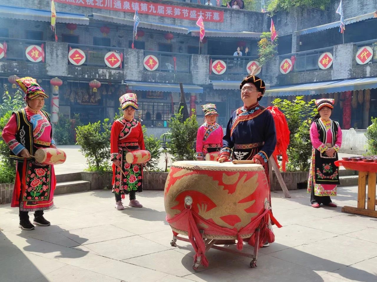 4月26日上午10点,老师们和同学们乘坐校车到达北川神木羌寨,热情好客的西羌人民在神木寨的门口为大家举行进寨仪式,击鼓鸣锣,燃放狼烟,西羌人民为大家戴上羌红,递上一碗咂酒,在一声声的“纳吉纳鲁”中为大家献上最美的祝福。