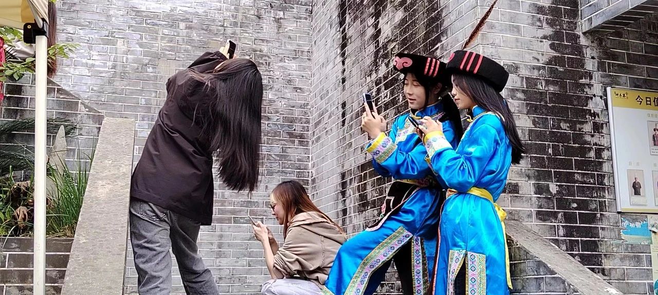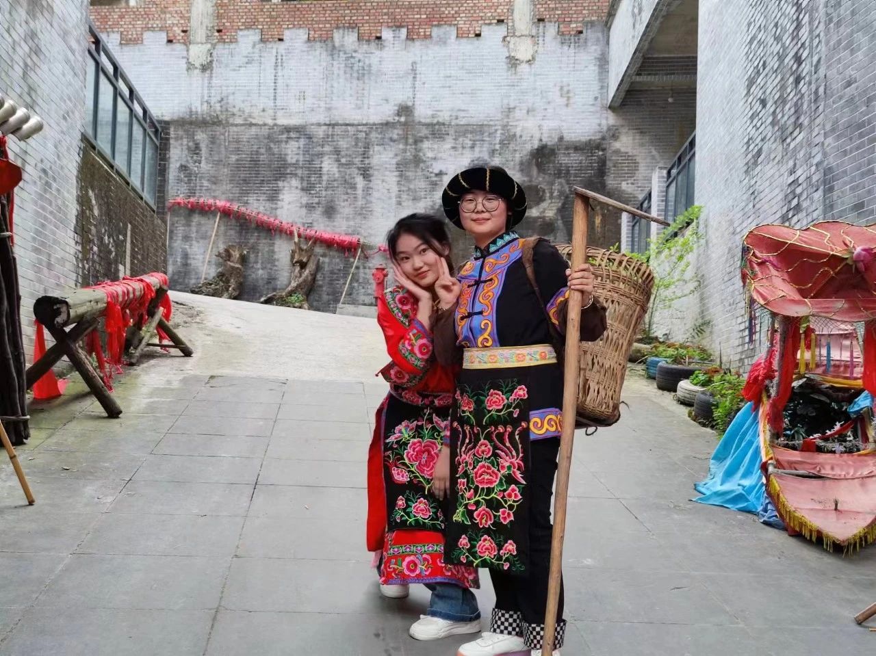 午饭过后,大家为了深刻感受羌族文化内涵,在神木寨村民的指导下试穿了羌族服饰,头戴一片瓦的头帕,肩上披着云肩,腰间穿着围兜。