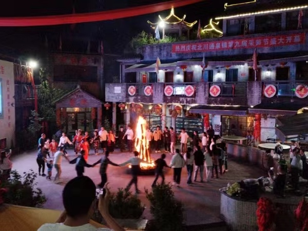 之后,由羌族同胞教同学们唱羌歌、跳沙朗舞、解疙瘩舞等。夜幕降临时,神木寨在庭院中央由羌族同胞和老师们一起点燃了象征光明与希望的篝火。在篝火晚会上,同学们与羌族人民一同舞龙,围着篝火唱着羌歌跳着沙朗舞、解疙瘩舞等。大家在欢声笑语中与羌族人民建立起了深厚的情谊,也在互动交流中看到了民族文化的欣欣向荣。