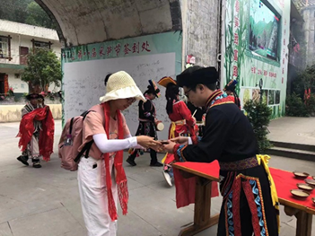 5月27日上午9:50,老师们和同学们乘坐校车到达北川神木羌寨,热情好客的西羌人民在神木寨的门口为大家举行欢迎仪式,击鼓鸣锣,燃放狼烟,西羌人民为大家戴上羌红,递上一碗咂酒,在一声声的“纳吉纳鲁”中为大家献上最美的祝福。