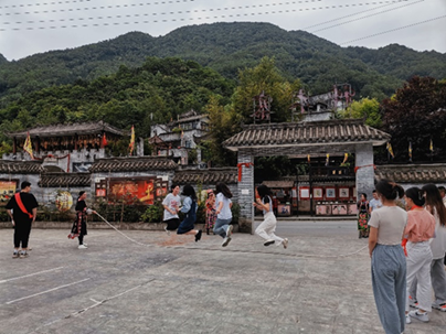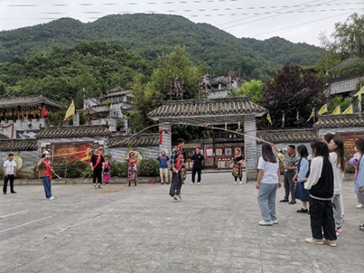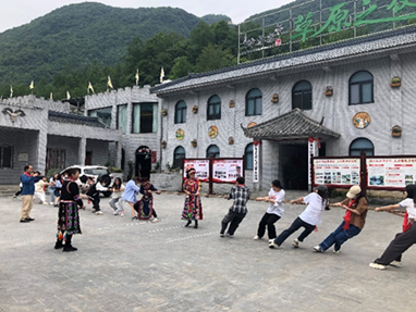 进入神木寨并稍作休息后,寨主夫人组织大家进行体育活动,拔河比赛、击鼓拍球、神彩飞扬,变幻交错的步伐、翩飞起舞的弧线、响彻云霄的呐喊,师生们与西羌人民一同欢呼,定格下闪光的瞬间。