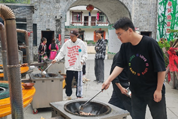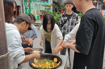 28号上午师生们吃过早餐后开始自由组队进行田野调查,大家为了深刻感受羌族文化内涵,在神木寨村民的指导下试穿了羌族服饰,头戴瓦片帽,肩上披着云肩,腰间穿围兜。寨主夫人向大家介绍了羌族服饰上的族花——羊角花,大家对羌族服饰文化有了更深的了解。之后,师生们同羌族人民一起学做柴火鸡,捏玉米馍馍,品尝羌族特色锅锅窑,充分体验了当地饮食文化。