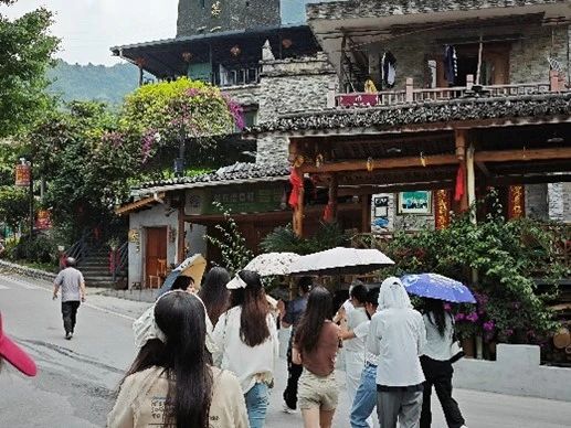 午饭后,稍作休息,开启返程。沿经吉娜羌寨时,柯老师带领同学们短暂参观羌寨。吉娜羌寨地处北川,隶属北川擂鼓镇,是从绵阳进入北川的第一个村庄,被誉为“北川第一村”。这里原名为猫儿石村,大多数村民是羌族人。在这里,我们看见幽邃伟岸的碉楼傲然挺立,碉楼外墙淡雅素洁,家家户户的房顶上,白石兀立,尽显羌族文化。同学们感受到羌族的建筑特色,羌族文化与现代文化的结合。