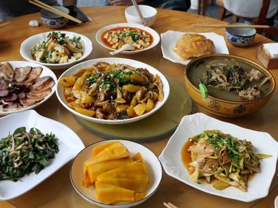 中午在清风寨就餐,香喷喷的羌族菜肴,引诱着大家的味蕾。鲜香味美的羌族菜,让同学们大快朵颐,其中不少山肴野蔌让同学们感到好奇,其味道可口,满足同学们的味蕾。
