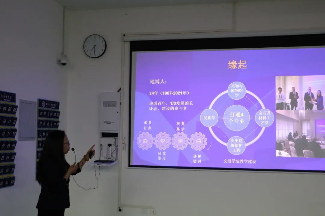 本次讲座由,中国地质大学(北京)专业学位研究生校外导师,原中国地质博物馆岩石矿物研究室主任,中国珠宝玉石鉴定评估专委会委员,我院专业教师吕林素教授主讲。与会成员:文物与博物馆学院院长宋大川,文物与博物馆学院党支部副书记兼办公室主任王君钢,文博学院部分专任教师以及文博学院2021级、2022级学生。我院师生积极参加,认真聆听,加深了对地质博物馆的认识,了解了中国地质博物馆建设的过程,感受到了其建设的意义。