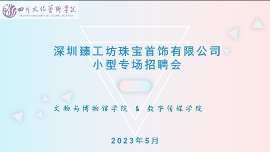 为提供应聘面试技巧与就业指导,为文物与博物馆学院宝石及材料工艺学专业毕业生更好地就业,文物与博物馆学院与深圳臻工坊珠宝首饰有限公司对接,于2023年5月22日下午3:30,在教学楼B栋206室召开宝石专业毕业生专场招聘会,与会人员有深圳臻工坊珠宝首饰有限公司新媒体经理曹洪刚,产品经理詹锦霞,品牌总监袁晓敏,数字传媒学院播音与主持艺术专业负责人欧阳骁锋,文物与博物馆学院党支部书记羊洋,文物与博物馆学院毕业班辅导员卢俊民以及部分宝石及材料工艺学专业毕业生。文博学院动员学生积极参与此次专场招聘会,通过简历制作、现场面试、学生个人与招聘单位的交流,提升了学生在现场应聘的技巧与能力,为毕业生提供了更多对口的就业岗位。