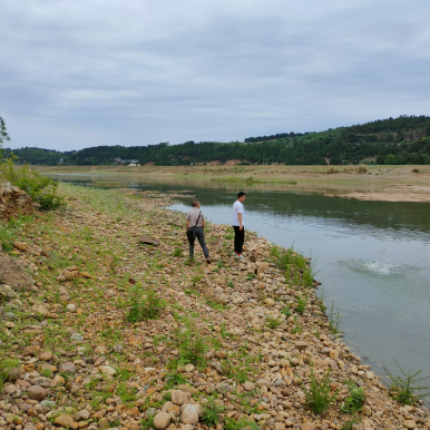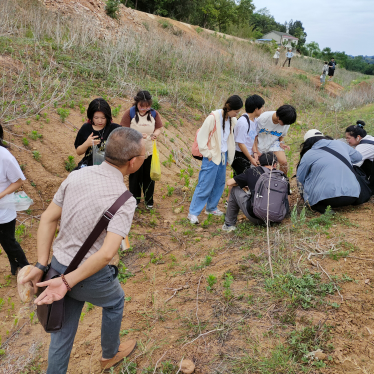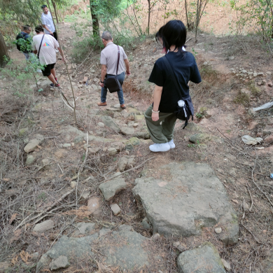 随后廖老师与张老师带领同学们前往龙狮码头,采集古代遗留下来的器物残片。在老师的带领下,同学们沿着古道的进行探寻,最终到达龙狮码头,这是由河流冲击形成的河漫滩,其地势低洼,处于山脚。