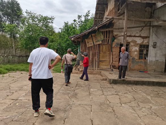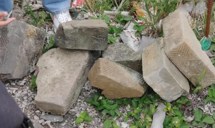 经过中午在基地短暂休整后,廖老师与张老师又带领同学们踏上寻找古寺庙的旅途,路途中发现有近百年历史的夯土墙民居内还有人居住,便前去拜访主人家并打听询问古寺庙的所在,经过指引后终于找到古寺庙,一栋近代重建有一间正房二间偏房的简易瓦房,在其房前屋后发现大量南北朝墓砖,砖上印有太阳与凤凰图案,其纹路在历史的冲刷下还是清晰可见,令在场师生惊喜万分。