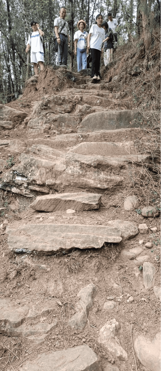 返回基地途中,师生发现存在千年已久的古道。廖老师讲解到,在古道旁的悬崖断壁上,曾存在唐代巨型佛龛雕像,但因地震灾害,雕像倒塌,面对已然消逝于历史长河的雕像,同学们喟然长叹遗憾不已。