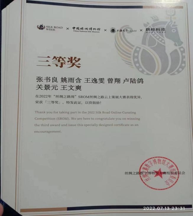 近日,在中国丝绸博物馆举办的“SROM丝绸之路云上策展大赛”中,我院2019级文物与博物馆学本科一班学生姚雨含与其他高校同学共同创作的“陶瓷:丝路踏歌”线上展览作品荣获文博组三等奖(全国第四名)。