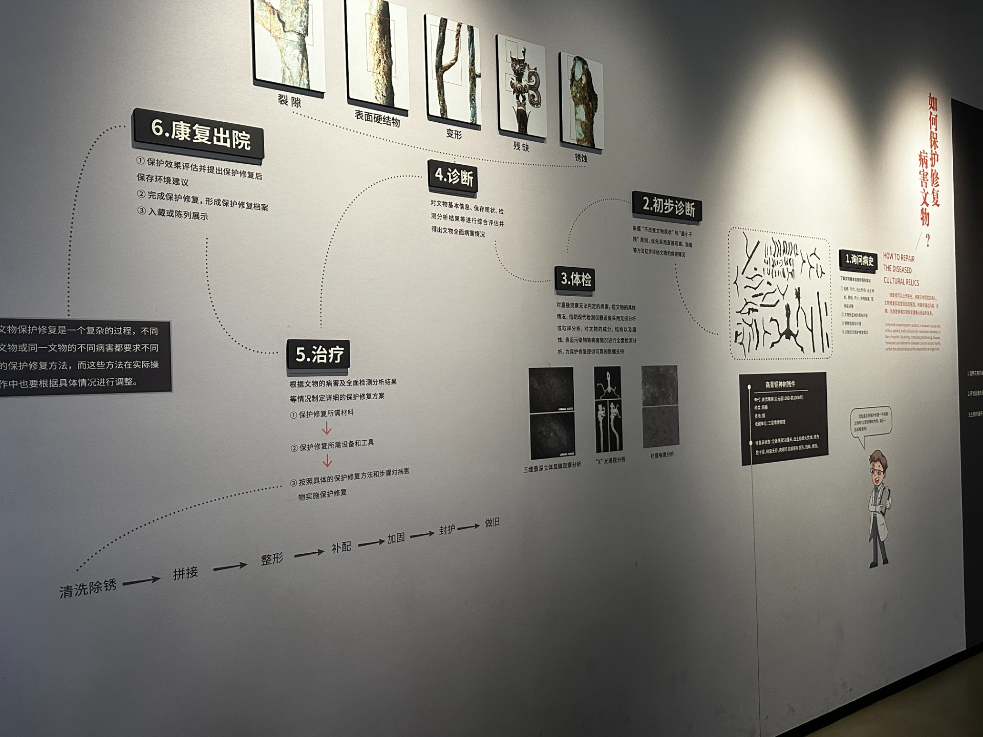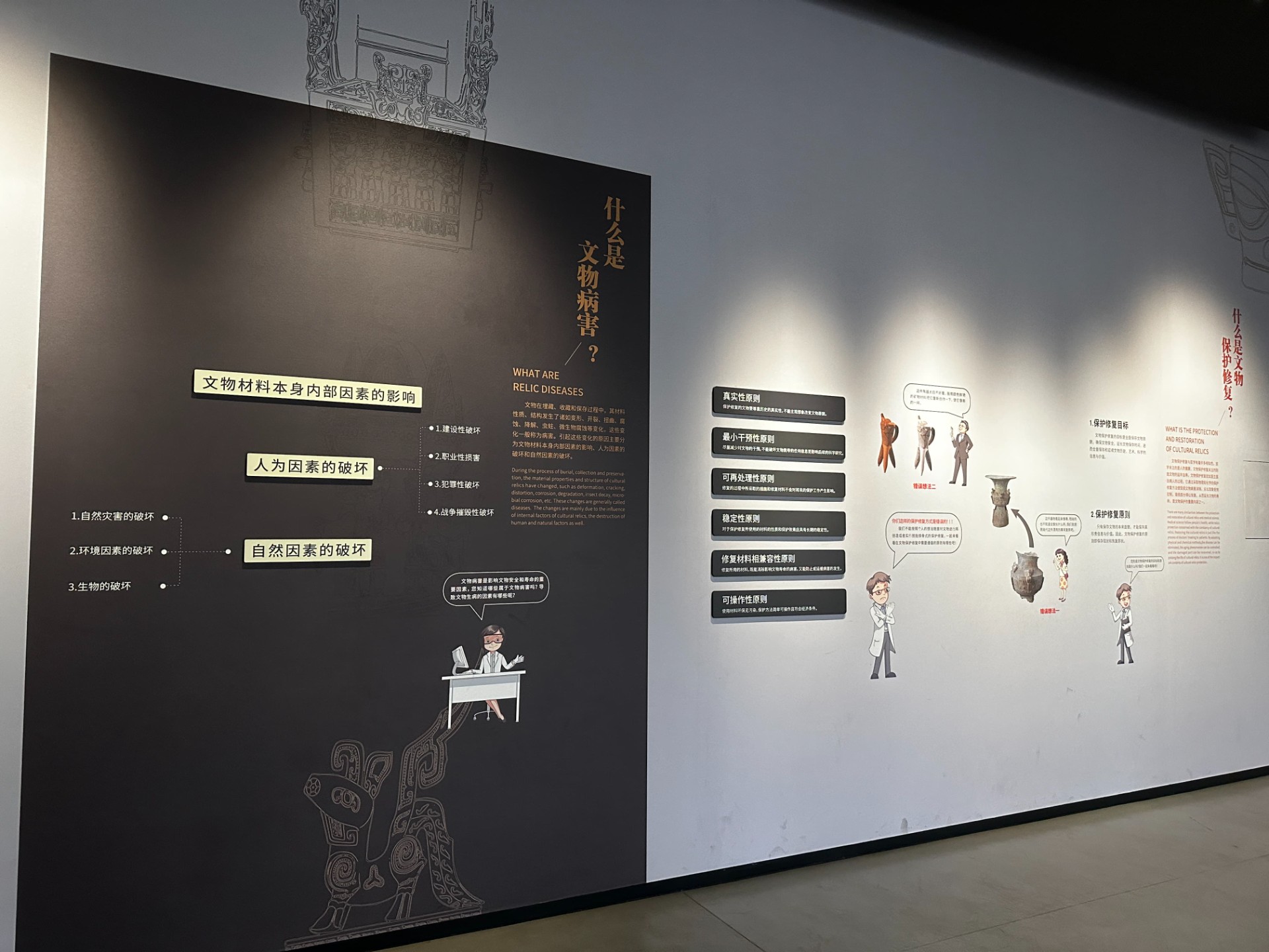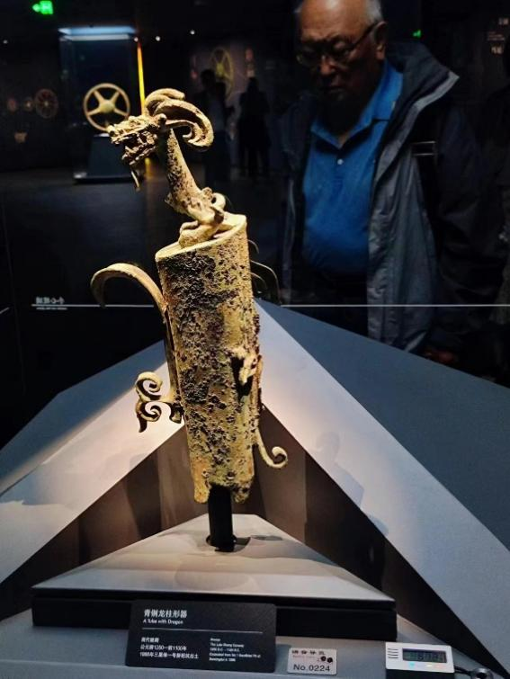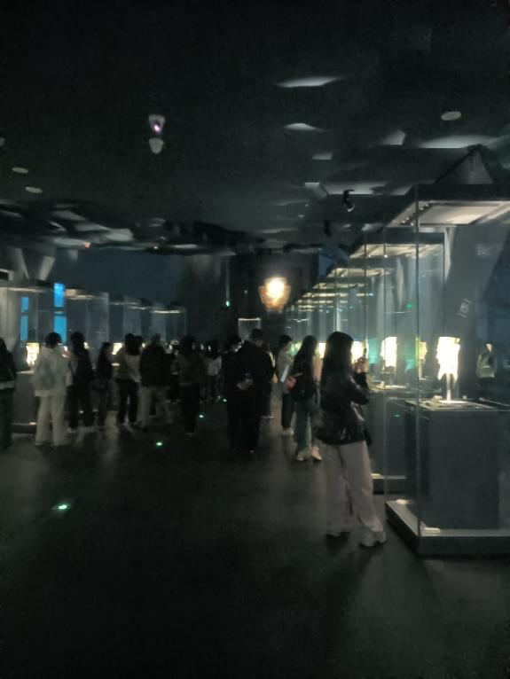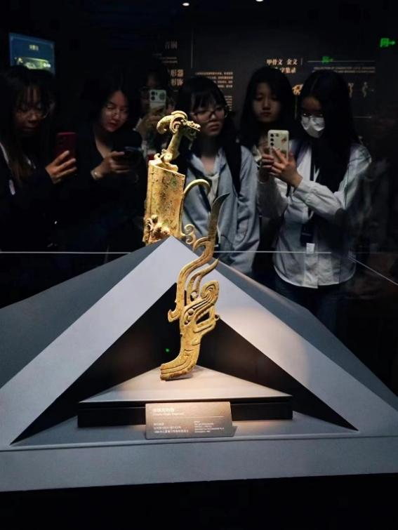 上午9点左右到达三星堆博物馆后,在老师与讲解员的带领下,同学们步入三星堆世界。一号展厅为《三星伴月——灿烂的古蜀文明》综合馆。其中展陈了金、铜、玉、石、陶等多类文物,以类设题,因题见意,纵向贯通、横向展开,介绍古蜀历史及三星堆古蜀国在多个领域取得的辉煌成就。该展厅以三星堆遗址全景挂屏为主体展品,神坛底部以一对造型奇特的神兽为原型制作雕塑,又以大型壁画《长江文明之源》为辅。在本展中同学们看到了雄踞西南的古蜀2000年的沧桑史;三星堆的农业与商贸;化土成器——三星堆陶器;以玉通神——三星堆玉石器;三星堆的冶炼;通天神树——古蜀人智慧与精神的象征。