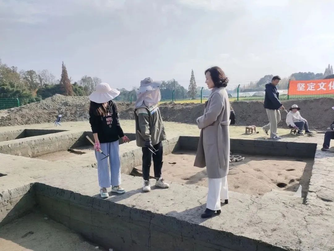 参观完宝墩遗址博物馆后,一行人在成都市考古工作队考古领队吴鹏的带领下来到了发掘宝墩文明现场某考古工地,现场为我们一一讲解重大发现,以及与文物与博物馆学院书记羊洋、文物与博物馆学专业负责人唐光孝交流如何培养社会专业实用性人才。